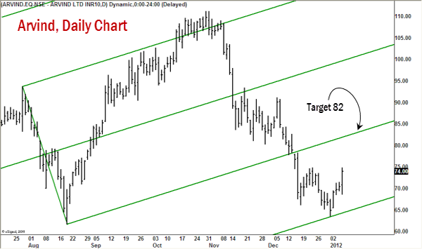 Arvind Ltd (Rs74): After a major downward correction off the 31 October high of Rs 111.15, the price action in the past few days indicates that the stock is in a short-term uptrend. A rally to the short-term resistance at Rs 82 appears likely.
