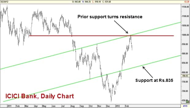 ICICI Bank (Rs 931.60): After a sharp run-up in the recent weeks, the stock has gotten into a short-term downward correction this week. The price action suggests that a test of the short-term support at Rs 835 appears likely. Those holding long positions may take at least partial profits while traders may consider short positions with a stop-loss at Rs 995 for a target of Rs 835 ( **See chart** ).