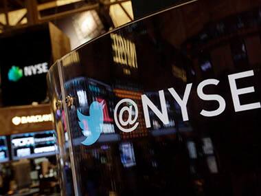 The Twitter bird logo is on an updated phone post on the floor of the New York Stock Exchange. AP[/caption]