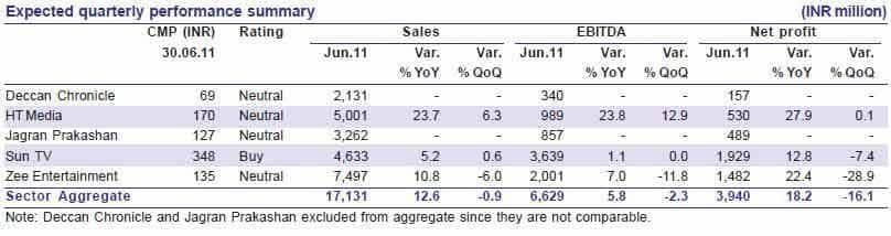 Investors could look forward to a fall in profit growth for media companies. While the average revenue growth across print and television could stay flat over March 2011 quarter, the profit growth could fall to an average 16 percent in June 2011 quarter.