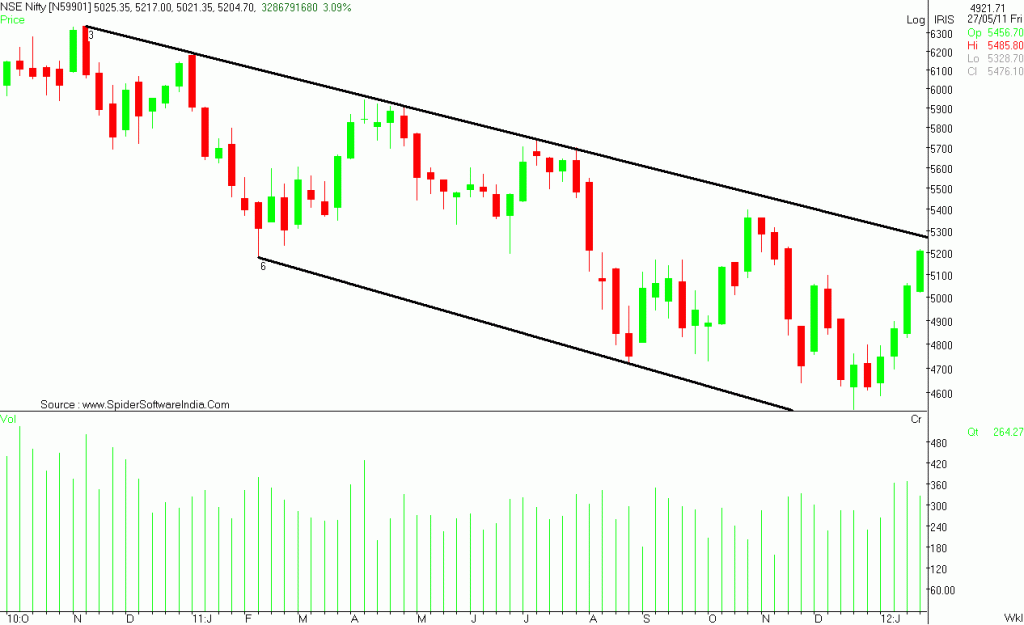 Rohit Srivastava, Fund Manager for Sharekhan ProTech PMS, is of the view that 5,280 is the next key level to watch out for, as this is where a falling Nifty is expected to meet the downward channel (see chart below). A breakout above this channel can be very sharp, which can take the Nifty to 5,675 levels.Above this level, the Nifty has the potential to test the previous high of 6,335.90.