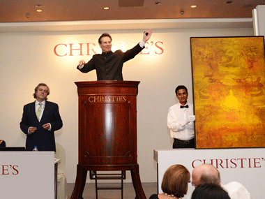 Art auctions have a reputation for being daunting, boring places. A bunch of very rich people twitching occasionally to show that they’re bidding enormous amounts on a painting or sculpture — this doesn’t seem particularly exciting. But don’t trust those depictions of art auctions. Yesterday evening at the Crystal Ballroom in the Taj Mahal Hotel in Mumbai, Christie’s held its first sale in India and it was anything but boring. In the course of the evening, record prices were reached and the total earnings added up to Rs 96,59,37,500 (that’s US$ 15.4 million). [caption id=“attachment_1298837” align=“alignleft” width=“380”]