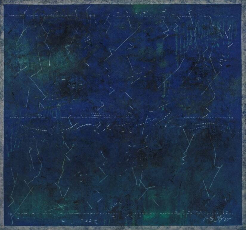 Moving into a darkened room at the back, I view a video of the artist in conversation with Adam Szymezyk, talking about his medium and background, and it gives us a little insight into his creative process. Haloi talks about how he is deeply influenced by Indian miniatures and folk art. Watching miniaturists at work he noticed that the paper they were using was Nepali paper which was readily available in Kolkata in those days, “and I decided to use it because I use opaque colour which grips the paper, unlike transparent colour which is like a stain”. He talked about how when he returned to Kolkata after a stint in Ajanta, the kind of contemporary art on display at the time was largely figurative, with few abstractions. [In 1957, he was appointed by the Archaeological Survey of India to make copies of Ajanta murals. Seven years later, Haloi returned to Kolkata.] In yet another video interview he talks about how separation or any form of departure is linked with pain — a major theme of his work at one point in time.