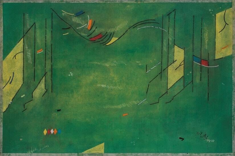 Of what makes Ganesh Haloi’s style so unique, Reena Lath says, “All artists make or create their own language through their art, their own style; however, the topic or the expression in each body of work is different. It’s like a writer or poet who has created a particular style of writing, yet each story, or poem is different each time. Yes, there are certain motifs and symbols, lines and dashes which appear each time in his paintings, also a texture that emerges, but I cannot say they are constant. In fact they are constantly evolving. “ The playful relationship in nature between form, balance, rhythm and colour is what seems to define this body of work, executed with an elegant and light ease of touch that makes the paintings a pleasure to view. Hints and clues gesture to a world of graceful natural forms without explicitly spelling out the reference. Greens and blues predominate, and the overall effect is to make us view the world of nature afresh through the eyes of an artist who refuses to age. At Akar Prakar, P 238 Hindustan Park, Kolkata, until 11 February