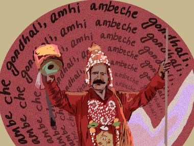 Editor’s note: This article concludes a five-part series documenting the folk dances of Maharashtra. Read more from the series here . *** The story goes that the dance form known as the ‘gondhal’ was created when the warrior-sage Parashuram, having killed and beheaded the demon Betasur, sewed the sinews of its head into its crown and fashioned a musical instrument out of it. Playing this macabre instrument, Parashuram danced to thunderous, alarming rhythms, in praise of his mother, the Goddess Renuka. Parashuram’s dance was called the gondhal. Even today, the gondhal is performed as a ritualistic folk dance to appease the goddesses Renuka, Bhavani or Amba. *** Humans took to dance and music from as early as the first stages of evolution to express themselves; to celebrate a successful hunt or a good harvest or even relationships between men and women, says Prakash Khandge, the founder and head of the Lok Kala Academy of the University of Mumbai. So also, he continues, “All folk art came to be when human civilisations started appeasing supernatural powers. Subsequently, with the advent of the agrarian culture, we started the tradition of ritualistic dances for deities that would guard our homes and would take care of the fields.” Ahead of a wedding or a thread ceremony, male and female members of the Gondhali tribe, better-known as waghya-murali, are called upon to set up a “jagran-gondhal” and ward off the evil eye on a night filled with dance, music, and lore. Drought-prone villages or towns engulfed in woes and conflicts also summon the travelling troops to call upon the goddesses, to infuse hope and provide a respite from their predicaments. *** [caption id=“attachment_7715151” align=“alignnone” width=“825”]  A gondhali cries out to the goddess during a performance to awaken the warrior within her, who would protect the village from all evil. Illustration by Rini Joseph/ Firstpost[/caption] In a typical performance, the booming voice of the Gondhali leader cries out to the goddess to awaken the warrior within her, calling on her to destroy the evil that has engulfed society. In powerful intonations, he invites the goddesses to the gondhal, seemingly casting a protective shield around the community and gradually putting everyone in a trance. Gondhal mandala ga Ambe, gondhala la ye, Gondhal mandala Bhavani, gondhala la ye In one such popular gondhal, the leader sings in a loud voice to awaken the goddess’ vitriolic avatar, ‘Aai Bhavani tuzhya krupene tarasi bhaktala (Oh Ma Bhavani, save your devotee)’, and calls upon her to ameliorate the crisis that has befallen the villagers. In another song, the gondhali cries out, ‘Ambe che gondhali, amhi ambeche gondhali (We are the _gondhal_is of the goddess Amba).’ Udhe ga ambe udhe, Udhe ga ambe udhe (Hail goddess Amba!) *** Performed to a great extent in the Marathwada region, the Gondhali tribes also hail from around these parts. The Kadambrai worship goddess Bhavani, whose seat is at Tuljapur in Osmanabad district, while the Renurai sect sings songs of the goddess Renuka of Mahur in Nanded. The waghya-murali dance together in a circular formation surrounded on all sides by the village-folk, holding the ghati, a cymbal-like instrument in one hand. The sambal, a pair of wooden drums played with two sticks, is thrown around the shoulders of a few others. It rests on the musician’s thigh and produces the high-pitched ‘trun-trun-trun’ sound that had once seemingly emanated from Parashuram’s instrument. *** As long ago as the reign of Shivaji Maharaj, centuries before the Peshwai, the Gondhalis were a widely respected group who were invited for the ritual by the rulers themselves. They were said to be knowledgeable about politics and economics and would often sing about social concerns, spread social messages through their songs such as respect for one’s elders and dedication to the well-being of one’s family. In spite of being performed in front of a large audience, the gondhal has always been a community dance, or a ritualistic performance accompanied by a small puja for the goddess, as opposed to folk art forms meant primarily for entertainment (such as the lavani ). Smearing their foreheads with halad (turmeric), the waghya-murali dance in a bent-back posture (or kamal kalika) to the gondhali’s verses and elucidate the victories of the goddesses over demons. The hand gestures of the murali strongly resemble the gajagras, or an elephant picking sugarcane in his trunk, while their performance has a lot of rapid jumps, leaps, circular movements and occasionally a dramatic gesticulation of the story. *** As a tribe, the Gondhali community has stringent rules of conduct. Performers are eligible to participate in a gondhal only after amassing knowledge about social structures, scriptures, traditional teachings, and forming their own observations. Gondhal is one of the few rituals free of the shackles of caste and a gondhali asserts this by virtue of treating everyone on par. The dynamic, energetic movements of the dancers, who are heavily ornamented, dressed in bright coloured clothes and tossing flaming torches back and forth in their hands, produces a certain momentum, a flow of energy moving towards the supernatural, thrusting the gathering into a feeling of oneness. Sometimes, the dance is so invigorating that the men in the crowd also begin whirling round and round in a dream-like state, as though in communion with the divine. Letting their hair down, women participate in the ritual as well, by rotating their necks round repeatedly, and inviting the deity into their being. *** Until the early last century, children between the ages of 4-5 were given away to the _Gondhal_i community in fulfilment of a navas — a promise made to Lord Khandoba in return for his blessing. These children were taught to play sambal, tal (cymbals), chaundke drums, conch and the stringed tuntune, all of which lend the