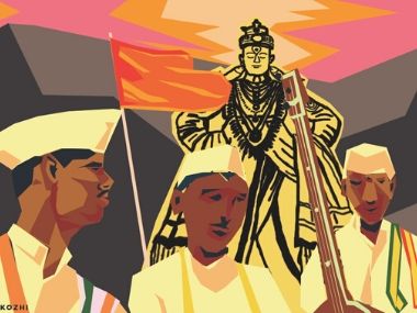 Editor’s note: This article is the second in a five-part series documenting the folk dances of Maharashtra. Read more from the series here . *** Many cultural paradigms in Maharashtra are closely aligned with prayer and devotion, yet the overwhelming fervour with which the annual pilgrimage to Lord Vithoba’s seat in Pandharpur is conducted, is an expression of faith beyond compare. Although accounts vary as to the maiden journey of this pilgrimage, many believe it was the prolific saint-poet of the warkari cult, Dnyaneshwar, who first undertook the wari in the 13th century. A belief in the eternal, that inspires warkaris to go on this march, has been for ages inextricably entwined with the tradition of kirtan — storytelling through music and dance. Over time, and from the unwavering faith of the Bhagwat Sampradaya (or the warkari cult), has emerged the folk dance of the wari — the dindi, or warkari-kirtan. It is believed that the ‘efficacy of the dance lies in opening the gates of heaven’, AJ Agarkar writes in Folk Dances of Maharashta. In the first weeks of Ashadh (the fourth month of the Marathi calendar), the wari takes off from the temple of Lord Vithoba (a manifestation of Vishnu) in Alandi. Over a period of 21 days, warkaris traverse a 250-km-long path on foot to reach the Pandharpur shrine on the day of Ashadhi Ekadashi. The dindi dance performed en route the abode of Vithoba-Rakhumai is a blend of stories narrated through abhangas or kirtan and bodily movements that are well-executed but mostly extempore. Dindi stands for a wicket-gate, the dance deriving its name from a similar interlocked, row-like formation observed in the performance. However, colloquially, dindi has also come to mean a group of warkaris travelling together. One of the more cumbersome stretches of their walk is through Dive Ghat, some 20 km from Pune. Warkaris trudge along the winding road in late June as intermittent showers quell the scorching heat. Here, the warkari-kirtan comes alive. The bulls carrying the palkhi with the paduka (footwear) of the saints Dnyaneshwar and Tukaram are changed halfway through Dive Ghat and sturdy, fresh animals are harnessed and readied for the next leg of the journey. When the palkhi halts, the warkaris are set to the task of drawing a rangoli from end to end on the narrow roads in bright colours like pink, green and red. [caption id=“attachment_7618821” align=“alignnone” width=“825”]  Illustration by Rini Joseph/ Firstpost[/caption] Chanting the Lord’s name — ‘Dnyaneshwara Mauli, Dnyanaraja Mauli Tukaram’ — hundreds of devotees from every dindi accompanying the saints’ palanquin then form two rows within their own groups, with a veena or mridangam player in their midst. Agarkar points out in his book, that in warkari cults, dindi also means the group that follows a veena or mridangam player on the instrument. Some pilgrims also converge in a circle around the palkhi which is bedecked in garlands of blooming roses and marigolds, each with a tal (a pair of cymbals) in their hands. As the dindi is danced whilst journeying to the temple, Agarkar explains that the movements tend to progress in a line as devotees sway to the tune of the abhangas. The upbeat, quick rhythm of the mridangam floats in the air and the dancers (men and women) face each other. The first tap of the tal signifies the dance has begun. Warkaris put their right foot forward, stamping it lightly on the ground, while simultaneously bending at the waist. A short sideways step with the left foot follows. Then, as the right foot leaves the ground and settles at the rear, the dancers stand up straight, the tal now clicking near their waist. Thousands of warkaris singing the kirtan describing the feats of the God thus dance to the mridangam. The verses are soulful and quick; not so much that they would wear the warkaris out but enough to motivate them to keep walking. Warkaris showcase Dnyaneshwar’s faith that moved a wall of stone, and of Tukaram departing for heaven by flying on Garuda, Lord Vishnu’s vehicle. They narrate the story of young Namdeo who once went to the temple with offerings for Lord Vithoba and upon finding the food untouched, beat his head against the wall until the lord himself appeared to reassure the distraught lad and eat the food presented to him. It is mainly devotees from the Vidarbha and Marathwada provinces, situated in close proximity to Pandharpur, whose melodies flavour the abhangas of the wari. Dnyaboa mauli, tukaram Dnyaoba mauli, tukaram Tukaram, tukaram, Tukaram, tukaram The bhakti saints have left behind volumes of devotional and didactic poetry in the form of these abhangas, but more often than not, the devotee is content with simply chanting their names. The purpose of repetition in this devotional folk dance is indeed prayer but more than that, chanting the same verse over and over again also generates a rhythm for the devotees to march to. As well, some warkaris render soliloquies such as in a traditional kirtan, alternating between songs and poetry. They enact the events in these stories using simple gestures of the hands and feet, voice modulation and facial expressions. Many also carry a saffron flag or the dwaj, and during the performance fling it high up in the air, moving forward and backward in between the two rows. Up until the last few decades, the warkari-kirtan was among the few folk dances exclusively performed by men. There is no one prescribed costume for the performance but warkaris generally prefer to wear light, quick-drying travel-wear. Some occasionally flaunt an ochre-coloured ensemble, others opt for a simple white-coloured dhoti and kurta with a Gandhi-topi. The devotees also draw a small circle of sandalwood paste on either side of the forehead and in the centre, signifying their belief in the body’s chakras (the spiritual energy within the body). Now-a-days, women who walk the wari opt for a five-yard sari or s