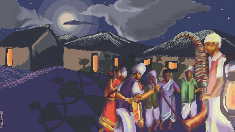 Editor’s note: This article is the first in a five-part series documenting the folk dances of Maharashtra. Read more from the series here . *** On an auspicious night, under a shimmering moon and amidst the glow of many lamps, dark shadows fall against the fractured walls of small cottages. Hand in hand, these silhouettes move in a circle along the narrow lanes of a village, hopping forward and backward to the music emanating from a severely nasal-sounding instrument. Warlis, Malhar Kolis and on occasion, the Bhil tribes of Maharashtra, thus usher in bountiful harvests, festivals and marriages by dancing to the high-pitched tunes of a tarpa. Performed by both men and women from the tribal communities, the folk dance is named after the wind instrument — known simply as tarpa nritya. Celebrated among most indigenous cultures as the king of folk dances, tarpa is the primary entertainment at social gatherings in the settlements of the Warli and Kokni tribes along the coastal strip of the Palghar district (around 200 km away from Mumbai), and for a few communities along the Satpura hills, as well as certain regions in the union territory of Dadra and Nagar Haveli. Comparable to a Scottish reel, an eightsome or a Dashing White Sergeant, tarpa is like a country-dance that is seldom taught and often just observed, as it is passed on from generation to generation. It is free-flowing and minimally choreographed, yet coordinated and synchronised. [caption id=“attachment_7568581” align=“alignnone” width=“825”]  Illustration by Rini Joseph/ Firstpost[/caption] Earlier paintings of the Warli community depict men and women banded together in a helix, symbolic of the eternal circle of life, with the tarpakar playing the instrument in their midst while today, every other Warli tote bag and embroidered fabric carries the imprint of this age-old folk art. For small clusters of agrarian communities and forest dwellers, it is a wordless expression of happiness and fulfilment. They rely on the tarpakar — who stands at the centre of a clearing with the performers around him — for the music, and on the udvya (or the leader of the group) for indicating a change in formation or a variation in the footwork. “The tarpa as a loknritya (folk dance) pulls together each and every person of the community as opposed to a choreographed act performed by a select few. This enhances the sentiment of unity and togetherness,” observes Vaishnavi Nimbalkar, a classical and folk dancer and performer. The dance is usually performed with men and women standing alternately. Women hold each other’s hands (skipping the man between them), and the men do the same. The performers then rest their hands at the back of the person in between, near the waist, and effectively lock the circle. The tarpakar introduces the first musical strains, a sound akin to a bagpipe, and the dance begins. Starting with slow, droning intonations of the same note, the performers warm up with a simple footwork — two steps forward and one step back. Tarpa comprises a range of footwork patterns; hand gestures — or what are known in classical dance as mudras — are rare. Intertwined dancers sway as one in a human chain, bound neither by the necessity to orchestrate a precise choreography nor to narrate a story. Instead, the dance reflects their natural surroundings in ways both obvious and less so. For instance, in the form of the tarpa known as bhat bhalanyacha nach, the participants stand in an arc, keeping their right foot in front and move forwards, backwards and sideways, resembling the paddy crops swaying in a breeze. During the gunjavayacha nach, they bend at the knees and imitate the act of picking leaves and twigs off the ground and putting them on their heads. In the lahuricha nach, they stand in a line, holding the waist of the dancer in front and move along a zigzag pattern — imitating the movement of the lahuri or grey francolin. Every foot pattern has its own tune and more and more variations are introduced as the speed picks up. Participants also from a circle that revolves around the tarpakar, hopping a few steps within the circle and a couple of steps back, gradually inching closer to him. A little way into the performance, the tarpakar gradually increases the laya (speed) through a uniform rhythm pattern. Two bamboo pipes covered in palm leaves and joined to a dried bottlegourd with honeybee wax produce music in this instrument. Three flute-like holes in one of the pipes maintain a constant note, while the other has six that can be manipulated. To an untrained ear, the music would sound more or less monotonous, for on a tarpa, much like the bagpipe, the same note cannot be repeated in succession and there are no pauses between two consecutive notes. However, every foot pattern has its own distinct tune. According to Nimbalkar, sometimes performers shout directions at each other, even as the change in the note of the tarpa cues a change in the footwork, in order to coordinate movements and avoid clumsy entanglements that could break the flow of the entire chain. During the performance, the tarpakar may take the music towards a slower rhythm, and then shift rapidly to a faster beat, again and again, for tarpa is not restricted by the stringent rules of laya and taal that govern several dance forms. It is as vigourous as the dancers. Through a number of such sets and ups and downs in the tempo, the dancers execute spontaneous variations in the footwork without missing a step and when the music slows they come to a steady halt. They continue stepping forward and then back in the same position until the pace picks up. And the dance begins again. The performers infuse many variations in the chain, sometimes drawing the figure eight around the tarpakar, at others moving like a train, or alternately throwing up a leg in the air as they move sideways. The performance carries on for as long as the dancers and the tarpakar k