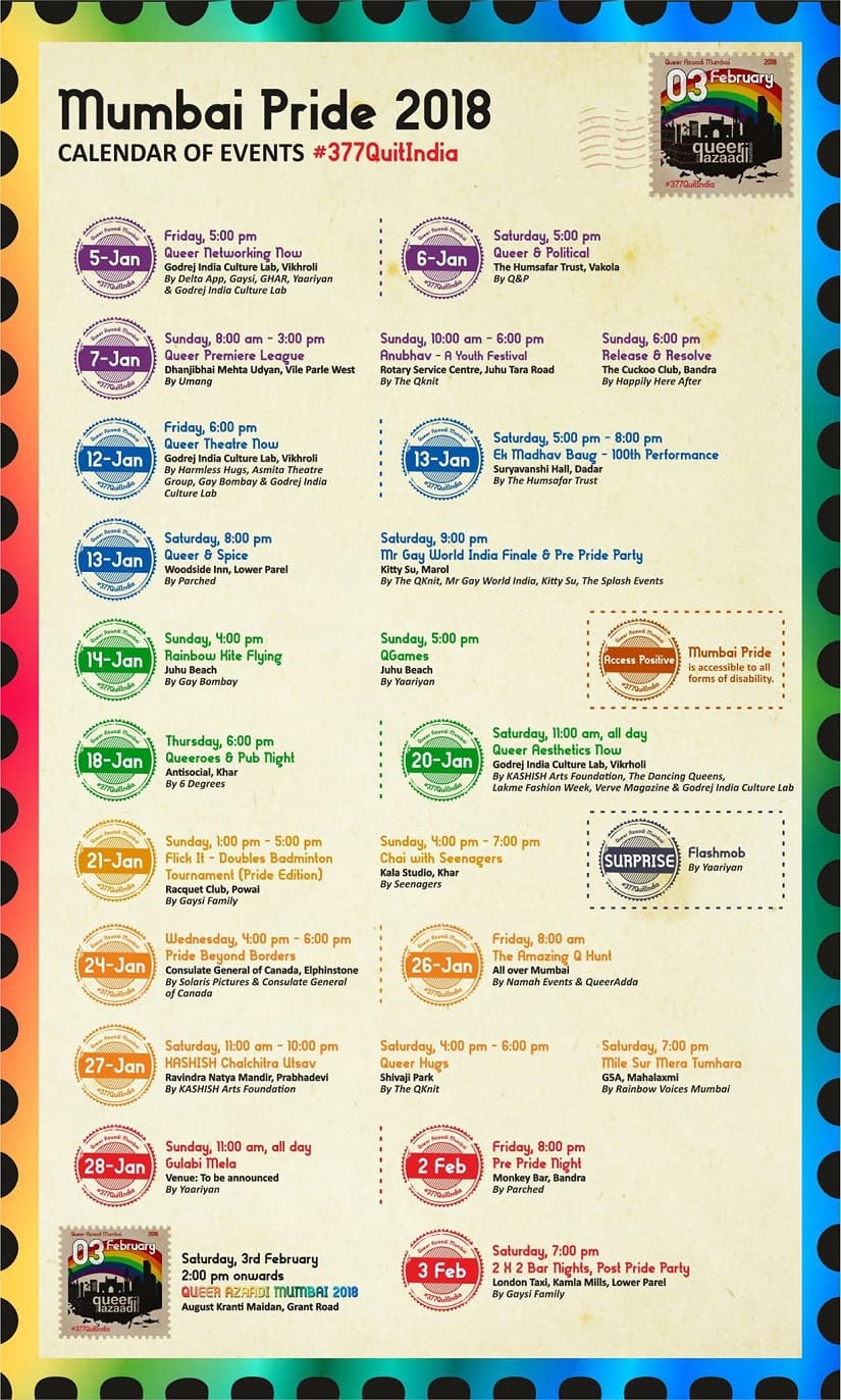 On 8 August 1942, at the Gowalia Tank — an area close to the present-day Grant Road Station in Mumbai — Mahatma Gandhi issued a call for the Quit India Movement. Seventy-five years later, at the same spot, Indians still await freedom from a draconian Victorian-era law — Section 377. Section 377 criminalises “sex against the order of nature” (which can be construed as any non-procreationary sex); like homophobia, this law too is a western import. And as Mumbai heads into Pride month — 30 days of activities planned across the city, in the run-up to the Mumbai Pride Parade on 3 February 2018 — it’s fitting indeed that the theme for this edition is #377QuitIndia, as chosen by organisers Queer Azadi Mumbai. Events like the Pride March/Month help build a feeling of “community” where each one helps lift the other up. This is essential — especially when you belong to a community that is ostracised. Here are some highlights of the Queer Azaadi Mumbai Pride Month and March. Inclusiveness: Initiated by Namma Pride, Bengaluru, the Mumbai Pride too is now inclusive for those with disabilities. There will be sign language interpreters as well as mobi-cabs that will ferry persons with disabilities to and from the Pride venue. Stamped: This is the 10th Pride March in Mumbai and the 75th year of the Quit India Movement. Queer Azaadi Mumbai is commemorating these anniversaries with ‘stamps’ — every event logo has been envisaged as a stamp. Take a look — [caption id=“attachment_4291357” align=“alignnone” width=“825”] ![Images courtesy Facebook/@qam.mumbaipride](https://images.firstpost.com/wp-content/uploads/2018/01/pride1.jpg) Images courtesy Facebook/@qam.mumbaipride[/caption]