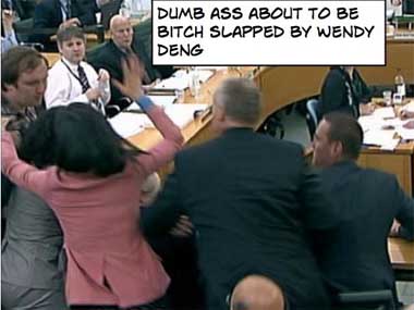 Wendi Deng has in the space of a few hours become a verb, the object of global admiration and quite possibly the public relations fillip her husband and step son needed in the wake of the whole #hackgate scandal. Deng’s lightning quick reflexes and impressive right hook as she (literally) leaped out at a man who tried to attack her husband with a foam pie during his parliamentary hearing yesterday, has inspired the romantic phrase, “ I would Wendi Deng for you”. This Facebook page titled ‘Mrs Murdock, Wendy Deng Bitch Slapping page’ went up online a few hours ago, and began quickly gathering fans who who chipped in with comments ranging from “You go girl!”, to “now i know why I love asian women…oh yes!” and “DEEEEENNNNNNGGGG Wendy!!!” [caption id=“attachment_44561” align=“alignleft” width=“380” caption=“Wall photo from the Wendi Deng Facebook fan page”]  [/caption] Minutes after the incident when a stunned, well slapped and foam-faced Jonathan May-Bowles, a.k.a. Jonnie Marbles was led away by police, the online community went berserk. Wendi Deng was a star. She had single handedly mitigated the frankly embarrassing performance of her husband who played the ‘confused codger’ card to the hilt during his hearing. News media began telling a suddenly information hungry and interested public who Wendi Deng really is. And there were the usual rush of hilarious articles like this one from Gawker and this from The Telgraph. Stand by your man? Oh yes. And because it’s just SO cool, here is the video: