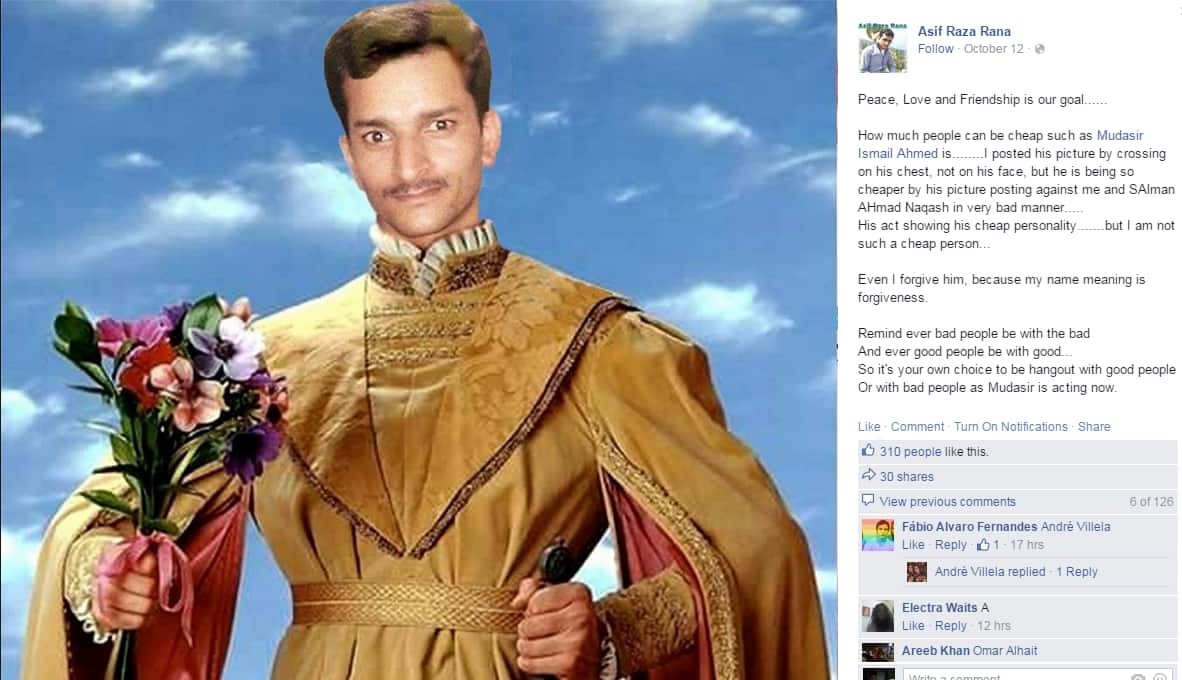On 13 September Asif Raza Rana, a resident of Gujranwala in Pakistan who claims to be a celebrity stylist, made a momentous announcement on Facebook that shook the Internet. Mudasir and he were no longer best friends.  But like every other person who has had to let go of their proudy, selfish and attitude showing friends, Asif moved on. Or at least seemed to. He went to the Chenab river with Salman and friends, created Team Asif and appointed a captain, and even claimed there was a potential for friendship to be restored. But it was not to be. “How much people can be cheap such as Mudasir Ismail Ahmed is……..I posted his picture by crossing on his chest, not on his face, but he is being so cheaper by his picture posting against me and SAlman AHmad Naqash in very bad manner…..His act showing his cheap personality…….but I am not such a cheap person…” Asif noted in a post as recent as 11 October with this picture:  And then suddenly when all hope seemed lost, on Friday this happened:  “Your ego seeks conflict; it loves nothing better than to win battles for you, sadly as it wins, you often lose respect and friendships. If you wish problems to persist, keep blaming everyone and everything but yourself, for he who persistently blames and criticise only fans the flames of hatred and controversy…….so from now Mudasir Ismail Ahmed and SAlman AHmad Naqash both are my best friends …..” Asif declared in the post. Was Salman responsible in some way for this? Will the trio now go to the Chenab? What will happen to Team Asif, Team Mudasir, the generals and colonels? None of these have answers. But then do we really care now that Asif and Mudasir are friends again?