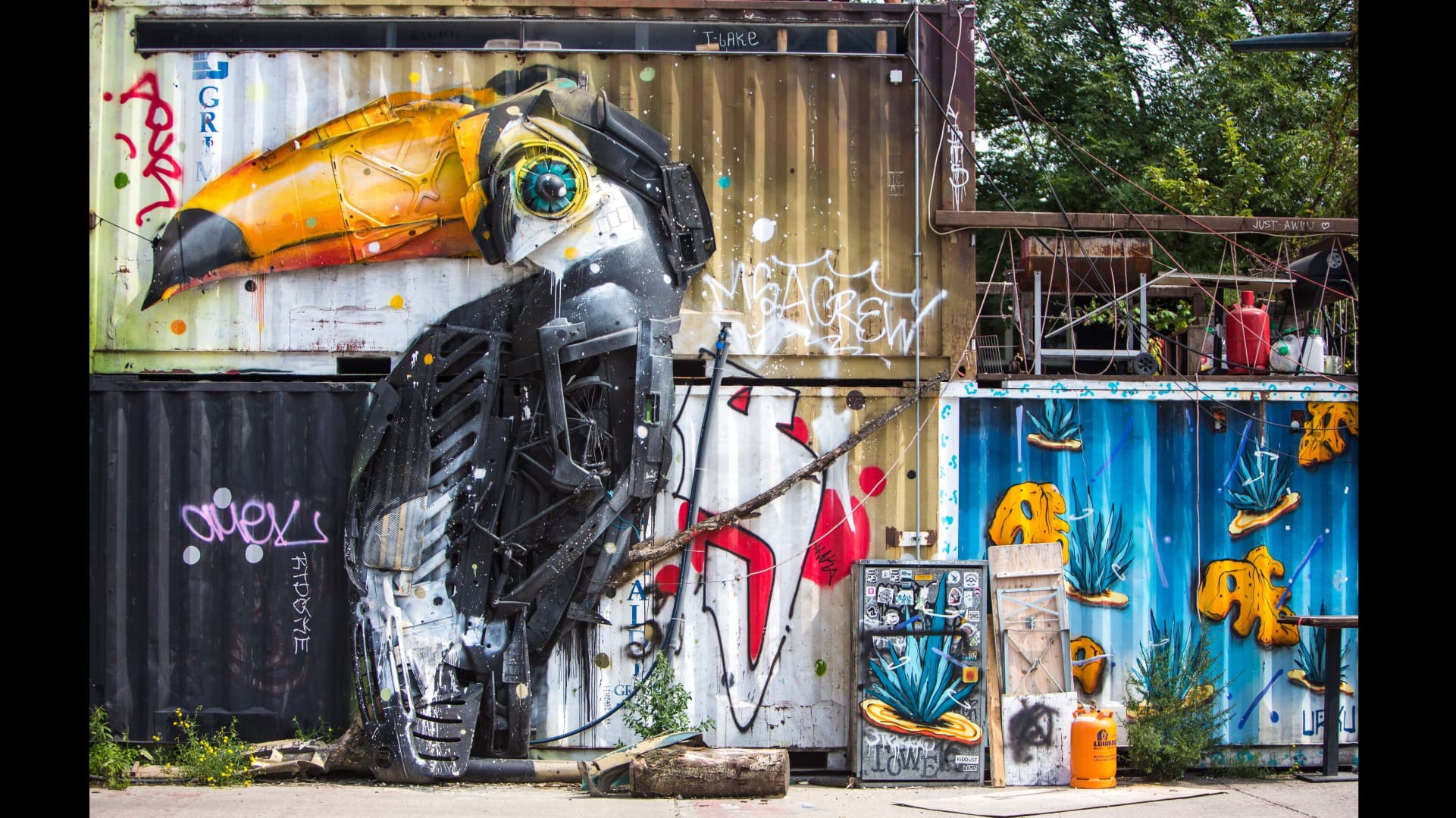 [/imgcenter] *** THE URBAN SPREE GALERIE is a 1,700-square mtr artist and exhibition space at one end of the RAW Gelände complex. It has a heavy emphasis on street art, including a coveted ‘Artists’ Wall’ which faces a busy road, with tens of thousands of tourists passing through daily, allowing maximum exposure for whoever’s street art graces it at any given time. The Gallery plays host monthly to invited international artists, while other parts of the space offer various artist residencies, as well as using its urban grassroots to help local talent hone their art skills through a series of workshops, and providing cool chill-out places to drink a beer, surrounded by street art on each and every available inch of wall space. *** This fantastic piece of multimedia street art, a toucan with various metallic parts making up its body, shows how much further street art has come from its tentative beginnings, and seems particularly apt in this post-industrial context. [imgcenter]