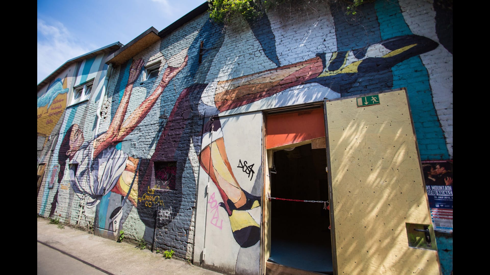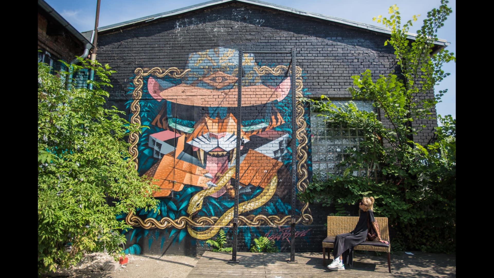 [/imgcenter] *** SINCE THE ’90s, the world of street art has changed enormously, and developed a much more complex visual vocabulary. This evolution can be clearly seen just a 10-minute walk away from the East Side Gallery: for here stands RAW Gelände, a huge post-industrial alternative culture complex. Originally created as a train repair garage in 1867, it went out of function in 1994 and fell into disrepair and disrepute. But in 1999, this collection of somewhat derelict buildings, workshops and warehouses got a new lease of life when the abandoned space was taken over and reclaimed to create an alternative sub-cultural complex. Today it provides everything from nightclubs, to exhibitions, a climbing wall, a gym, flea markets, a skate park, various cafes and beer gardens, and other spaces popular with the young cool Berlin crowd. And every inch of this space is covered with graffiti and street art of the new, modern, and ever changing variety. *** This mural marks the entrance to the popular outside climbing wall exercise complex. [imgcenter]