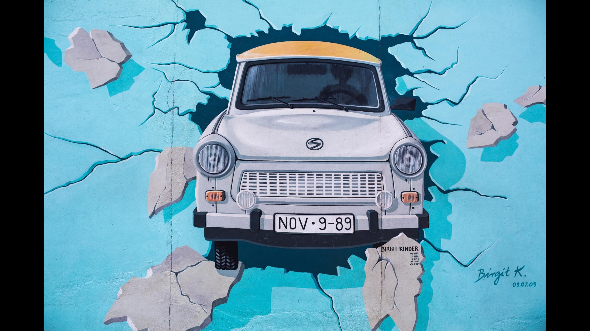 [/imgcenter] This is an iconic mural, painted by Brigit Kinder. It shows a car, symbolic of communist East Germany (for it was one of its most commonly used vehicles), breaking though the wall, and is supposed to be suggestive of all those East Germans who successfully managed to escape through and over the wall. [imgcenter]