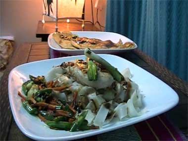 (Chicken breast stuffed with an Italian-inspired cheese and herbs mixture laid on a bed of Thai noodles and assorted vegetables — flavoured with a tangy and sweet Asian dressing)