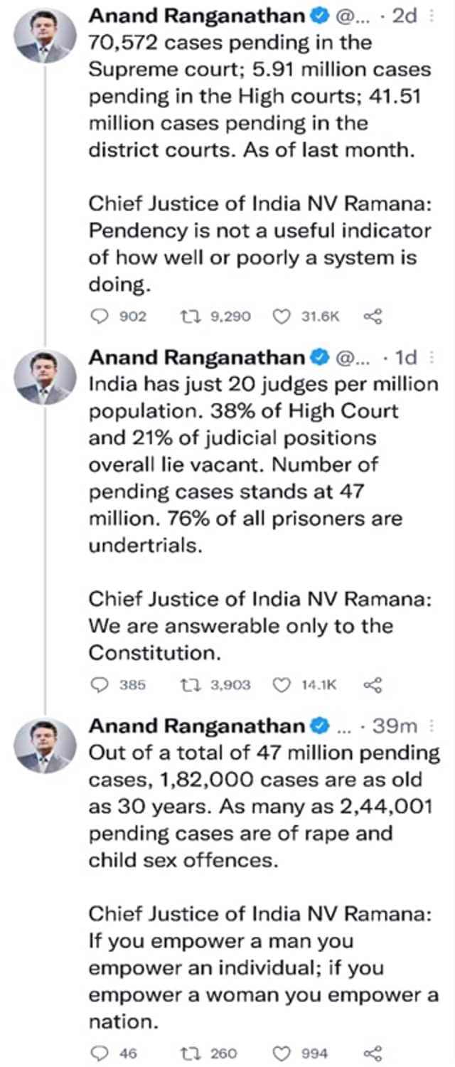So what is the metric for appraisal? In India, one should be the quick disposal of cases. Pendency is a huge problem, and a good bit of it is because of too few working days: too many holidays and a two-month vacation in summer and a two week vacation in winter. These days there is no reason not to run the courts in multiple shifts, including a night shift. And most work should be done online, so that litigants needn’t waste time waiting around courthouses all day.