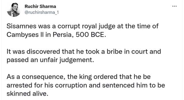 I think this fine distinction can be ignored, and India should institute four regional Courts of Appeal that will hear cases that exceed the state high courts’ jurisdiction, for instance inter-state disputes. One of the issues today is that the SC seems whimsical in what cases it decides to hear, and what it drops. For instance, it declined to hear a case brought by Kashmiri Hindus about their genocide saying the matter was too old, but paradoxically it agreed to hear a case about the Mahatma Gandhi assassination, even though that was much older. It takes up cases on cricket! Besides, certain influential lawyers (and certain NGOs) can get the Supreme Court to hear their clients at midnight, while others languish for decades. There must be clear guidelines provided by Parliament perhaps through a constitutional amendment. This should also put paid to such quaint notions as “constitutional morality” (Constitutions are not moral documents) or “original intent” (who knows what was going on in the minds of the Constituent Assembly; only what they wrote down can be discussed). In addition, the PIL mechanism should be dropped, and all cases required to be filed at the district or magistrate court, and they should bubble up through the system in case they have merit. It is deeply offensive to watch those with deep pockets, especially malign foreign-funded NGOs, getting their way with little effort by just waltzing directly into the Supreme Court. Appraisal and termination Judges are extremely important members of society, and the Supreme Court in particular is the last refuge for a common man. There should be mechanisms to ensure that the judiciary does not go off on tangents, but that they are working towards the common good of the nation. An ancient judge was executed and flayed alive. His skin was used to upholster a judge’s chair. What is more, his successor, his son, was forced to sit in that chair, on his dead father’s skin, to deliver his judgements. That is barbaric, but it does make a point. Judges must be immaculately neutral and scrupulous.