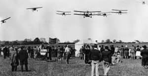 Cobham’s Flying Circus. Image Source: infozone.tv[/caption] Flying circus In the inter-war years, Sir Alan John Cobham, an English aviator, began what came to be known as “Cobham’s Flying Circus”. In 1932 he started these “National Aviation Day” displays. These consisted of a team of up to fourteen aircraft, ranging from single-seater aircraft to modern airliners, and many skilled pilots. It toured the country, calling at hundreds of sites, some of them regular airfields and some just fields cleared for the occasion. These were highly popular, giving thousands of people not only their first sight of an aircraft but in some cases their first experience of flying. The flying display included formation flights, aerobatics, daring parachute descents, till then unique upside-down flying, glider aerobatics, wing-walking stunts, and stunts like picking a hanky on the ground with a hook attached to the aircraft wing-tip. With the approval of the Air Ministry and the support of the entire aeronautical community, the displays were held over hundreds of towns. These were a source of inspiration for countless pilots in the Second World War. [caption id=“attachment_12143182” align=“alignnone” width=“489”]