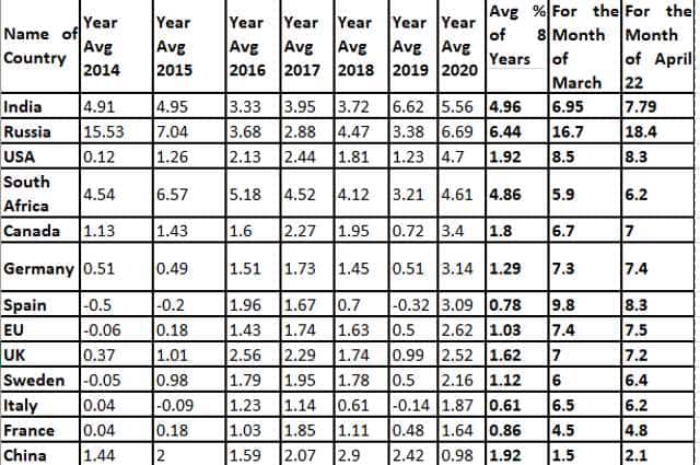 In the last two-three months, most people have been talking about inflation. The government’s cost-push inflation (CPI) data for the month of April 2022 also shows that the inflation rate has been 7.9 per cent, which is causing unrest amongst the general public. The general public is more concerned because of the exponential increase in prices of vegetables, fruits, grains, edible oil and petrol. Let us look into the phenomenon. There are mainly three types of inflation: Demand-Pull Inflation is caused by heavy demand and short supply. This type of inflation is caused by increased consumer confidence, growth of the economy, circulation or velocity of money, easy credit availability from the banking sector, heavy government spending and tax cuts, and high consumer expectations, which generate demand in the market. In a nutshell, the oversupply of money in the market generates demand in the market and supply becomes short, resulting in inflation in the market. Cost-Push Inflation is the situation in which input costs like raw materials and other inputs like wages increase the cost of production and the ultimate sale price becomes costlier. Such a type of inflation is caused by a rise in the exchange rate, which results in costlier imports. The main causes of cost-push inflation are high public debt, which results in currency printing and devaluation, high input costs, increased taxation, and monopoly or duopoly in a few sectors. Built-In Inflation is the situation wherein inflation is increased gradually by the efflux of time. Like every year, an increase in wages raises the cost of the product, while on the other hand, the worker creates demand as a result of the wage increase. Such a type of inflation is considered essential for the growth of the economy. Recent cases of inflation are not only adversely affecting India but also worsening the condition of other countries worldwide. We are witnessing the rout of Sri Lanka due to hyperinflation. A few people — call them pro-Left economists or anti-establishment, whatever moniker suits you —are fearmongering the populace through their statements, articles, or tweets that India has also entered the era of hyperinflation. These are the people who are looking at the one side of the coin only. A chart containing the previous eight years’ average inflation and the last two months’ average inflation of major economies is as under. This chart has been prepared from the World Bank/IMF data and whenever data for the current month was not available, the expected rate has been taken into consideration.