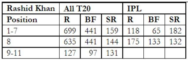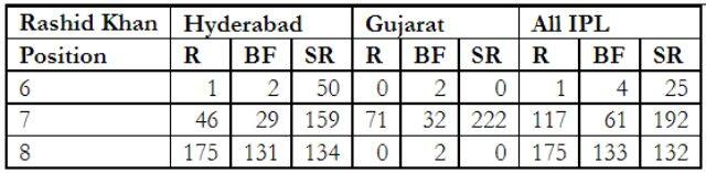 Eden Gardens, 2018. The giant cauldron was cheering for the local side, Kolkata Knight Riders, in Qualifier 2 of the IPL. Opening the batting, Wriddhiman Saha had top-scored for Hyderabad with a 27-ball 35. Shikhar Dhawan had scored a run fewer. Despite the 56-run opening stand, however, Hyderabad were struggling at 138/7 after 18.1 overs. The batters had crossed. With the second ball of the over, a young, strapping Shivam Mavi beat Rashid Khan for pace. Until then, Rashid had faced only one ball, from Prasidh Krishna, and had edged it for four. Now he stepped out and lofted it to deep point. Piyush Chawla, who had caught Yusuf Pathan brilliantly at the same position off the first ball, now dropped the catch. Six. [caption id=“attachment_10609161” align=“alignnone” width=“640”] ![Rashid Khan scored 31 off 11 from No 7 spot to guide Gujarat Titans to a win over Sunrisers Hyderabad. Image: Sportzpics for IPL](https://images.firstpost.com/wp-content/uploads/2022/04/Rashid-Khan-640-5.jpg) Rashid Khan scored 31 off 11 from No 7 spot to guide Gujarat Titans to a win over Sunrisers Hyderabad. Image: Sportzpics for IPL[/caption] Three balls later, Rashid played a similar shot. This time he cleared Chawla. Six more. It took Bhuvneshwar Kumar two balls to give Rashid the strike. Rashid lofted Prasidh over his head for four, played the now-familiar wristy swat-flick over square leg for six, and lofted over long on for six more. He remained unbeaten on a 10-ball 34 to take Hyderabad to 174/7. In another two hours, he had dismissed Chris Lynn, Robin Uthappa, and Andre Russell, caught Shubman Gill and Mavi, and run out Nitish Raha. He had virtually single-handedly destroyed Kolkata. But more importantly, the IPL got a glimpse of Rashid Khan the batter. He would shine from time to time, but at No. 8, opportunities were scarce. Besides, his bowling scaled altitudes so high that it hardly mattered. Four seasons later, Hyderabad caused a stir by not retaining Rashid. Gujarat Titans, one of the two expansion teams of the season, acquired him. And Gujarat approached the season differently from most other teams: they focused on building a very strong bowling unit. They focused on pace – even four of them and Pandya – backed by the spin of Rashid. For batting, they were happy to go in with Hardik Pandya (who might or might not have bowled), Shubman Gill (whose strike rate had been questioned during his Kolkata stint), David Miller (dangerous, if inconsistent); and Jason Roy. They were happy to fill the rest with domestic batters (Abhinav Manohar, Sai Sudharsan); batters who could bowl a few overs (Vijay Shankar, Rahul Tewatia); wicketkeepers who could slog; and Rashid. Roy would almost certainly have been a must-pick. But in his absence, Gujarat did not mind pushing batters a slot above where they usually bat. Thus, Tewatia bats at six for them and Rashid at seven. In fact, Rashid has already faced more balls at No. 7 for Gujarat than he ever had for Hyderabad, where he was the designated No. 8. This meant that Gujarat went in with long tails. Against Chennai Super Kings and Hyderabad, their last four were Alzarri Joseph, Lockie Ferguson, Mohammed Shami, and Yash Dayal. They did not swap any of them for a superior batter. Thus, Rashid batted at No. 7 on both nights. He was aware of two things. First, there was no one after him. And there was a set batter at the other end who would take it deep, so Rashid would have to take the risks. Gujarat needed 48 in three overs against Chennai when Rashid took 6, 6, 4, 6 off Chris Jordan. Two of the sixes were the trademark wristy flick, a shot that deserves a fancy name like the Helicopter or the Ramp. The other, another a slice over point. Three extremely difficult, unconventional shots that turned the match on its head. He scored 40 in 21 balls that night. However, before that Jordan over, he had already faced 12 balls. Batting a slot above his usual position enabled him to do that. Against Hyderabad, he hit a six off Bhuvneshwar Kumar – but that was his only boundary off the first seven balls he faced. Once again, batting a position higher gave him a few extra balls before he could take off, which he did, against Marco Jansen. Gujarat needed 15 off three balls, but Rashid sealed it 6, dot, 6, 6. A very aggressive batter, Rashid is probably suited more to No. 7 than to No. 8. Unfortunately, he did not get enough opportunities, for Hyderabad played a batter more than Gujarat do. At Gujarat, with more balls to face, he has made the most of his opportunities.
