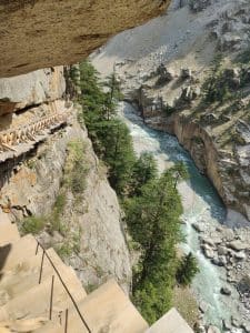 Confusion prevails about the history of Gartang Gali/Gully, an ancient pathway used for Indo-Tibetan trade and located on a vertical ridge in district Uttarkashi, for a long time. There are many theories about the making of the wooden pathway at an unusual location. Local people claim that the pathway was used for cross border trade by Jaad Bhotiyas. But, little documentary evidence is available on who constructed it and when? Extensive research proves that Gartang Gali was constructed by British timber tycoon, hunter, naturalist and writer Frederick Wilson for conducting secret excursions into Tibet for hunting and collecting information. Based on the documents available, it can be said that Gartang Gali is about 160-170 years old. Not the 200 to 300 years as per the theories that are in circulation. Unique Gartang Gali Gartang Gali is located in the picturesque Nelong valley in Uttarkashi. The 136 m long and 1.8 m wide pathway offers a skywalk experience. The Deodar slipper lined stairway, was renovated and reopened for tourists on 17 August 2022. Located at an odd location the route was used by traders from Taknore Patti for cross border trade with Tibet till 1962. After the India-China war the stunning wood structure had remained unused and in complete neglect for many years. Little clarity exists on Gartang Gali as till 1930s only temporary wooden bridges (Sanga), made from tree trunks, existed in Garhwal. The Gartang Gali was special in approach and design. [caption id=“attachment_12754292” align=“alignnone” width=“607”] A view from Gartang Gali[/caption] Ban of entry of foreigners in Tibet Foreigners were barred from entering the Tibet territory, so Frederick Wilson used this method of making a secret route to enter Tibet territory, rather regularly. Wilson had all the resources-manpower, money, timber stock and trust of Tehri King- to execute the operation comfortably. Famous as Pahadi Wilson and Raja of Harsil, the retired British Army soldier settled in Harsil (Uttarkashi) in the 1850s and married a local girl. He made the Indian Himalayas his home and used to go on adventure and hunting trips regularly. In the initial period Wilson made a living by selling wild animal and bird skin/parts in Mussoorie. Later he was involved in supplying timber sleepers to the railways and the new venture made Pahadi Wilson one of the richest men in this part of the world. Hinting about the wooden pathway Frederick Wilson constructed the wooden pathway and he hints about this project in his 1860 edited book and in an 1873 published article. Without providing any name of the location he provides details in A summer ramble in the Himalayas (1860), he writes, “Various are the contrivances to make a practicable path across these. Flights of wooden and stone steps, of fantastic forms and rude construction, serve the purpose in some of the bad places; and in other long planks are laid along the face of the rock, resting on wooden pegs stuck in the crevices.” Frederick shares this information in connection with a trek in Ganga valley area, where trees and bushes grow in crevices of the rock with little or no soil to nourish them. Adding more details he says, “…perpendicular rock, running from several hundred feet above, sheer down to the river.” A Gartang Gali like location, where a vertical granite stone wall exists and Jadh Ganga, an important tributary of the Bhagirathi, flows ceaselessly 200 metres below. Edited by Mountaineer, pen name of Wilson, A summer ramble in the Himalayas was developed by Frederick Wilson. He wrote many chapters to transform the manuscripts, containing some rough notes, into an interesting book on the Himalayas and adventure. More clues Pahadi Wilson provides more clarity on the Gartang Gali project, in his article A stalk in Tibet, published in Gentleman’s Magazine (Volume X, January to June 1973), by announcing that he has just completed a little excursion in Tibet. Terming the geographical condition of Himalayan extremely challenging than England, Wilson writes, “Set to work and build four or five miles of a broad flight of stone steps to the moon, send an army of navvies with sledge hammers to smash all to pieces, and you will have something akin to many of the hills in Tibet.” The distance between Bhairoghati to Nilang, via Gartang Gali, is about 6 miles. Almost the same distance as mentioned by Wilson in his piece. Route used for Tibet trade The old trade route from Harsil to Tibet used to pass through Jangla and Karcha, over the Kopanga hills, not through the Bhairoghati. All the tourist guidebooks and maps show the route away from Gartang Gali. Even the Mussoorie to Nilang route published in Guide to Mussoorie (1907) shows the path heading from Harsil, Karcha to Nelong. An 1878 survey of India map, Western Hundes and Tehri Garhwal, presents a clear picture and route used by traders for border trade. The map shows the trek passing through Jangla (See map), from where Nelong was about 20 Miles. The traders from Uttarkashi possibly began using the Gartang Gali to reach Nelong long after the death of Frederick Wilson in 1883. Wilson played a key role in improving communication on the Mussoorie to Gangotri route by constructing many bridges and improving the forest road. He built forest guest houses at Harsil, Bhatwari, Uttarkashi and Dharasu. Secret route for hunting and Tibet expedition Wilson was popularly known as Ranger of the Himalayas, and he was one of the most influential persons of this region in his time. He used to go into secret operations into Tibet from Bhairoghati. Shooting in the Himalayas by Colonel Fred Markham (published in 1854) presents a vivid account of the author going on a Bharal (Himalayan blue sheep) shooting expedition with Wilson in the deep Bhairoghati area (near Nelong). Even in his write up on Tibet tour (1870), Wilson discloses entering Tibet, where a ban on entry of foreigners existed. Many writers even claim