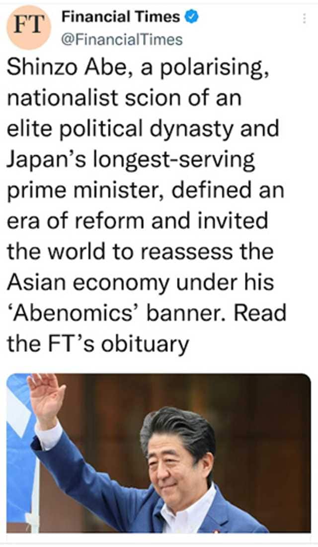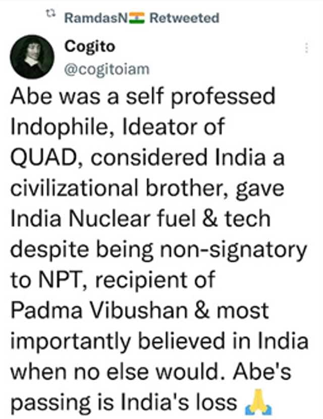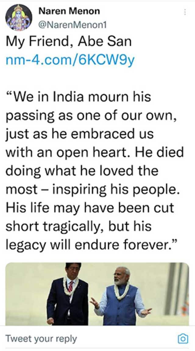 Abe San believed in India, and it showed. So much so that some of us are in personal mourning. India has lost its best friend, and in a world where it has no friends, that is a tremendous loss