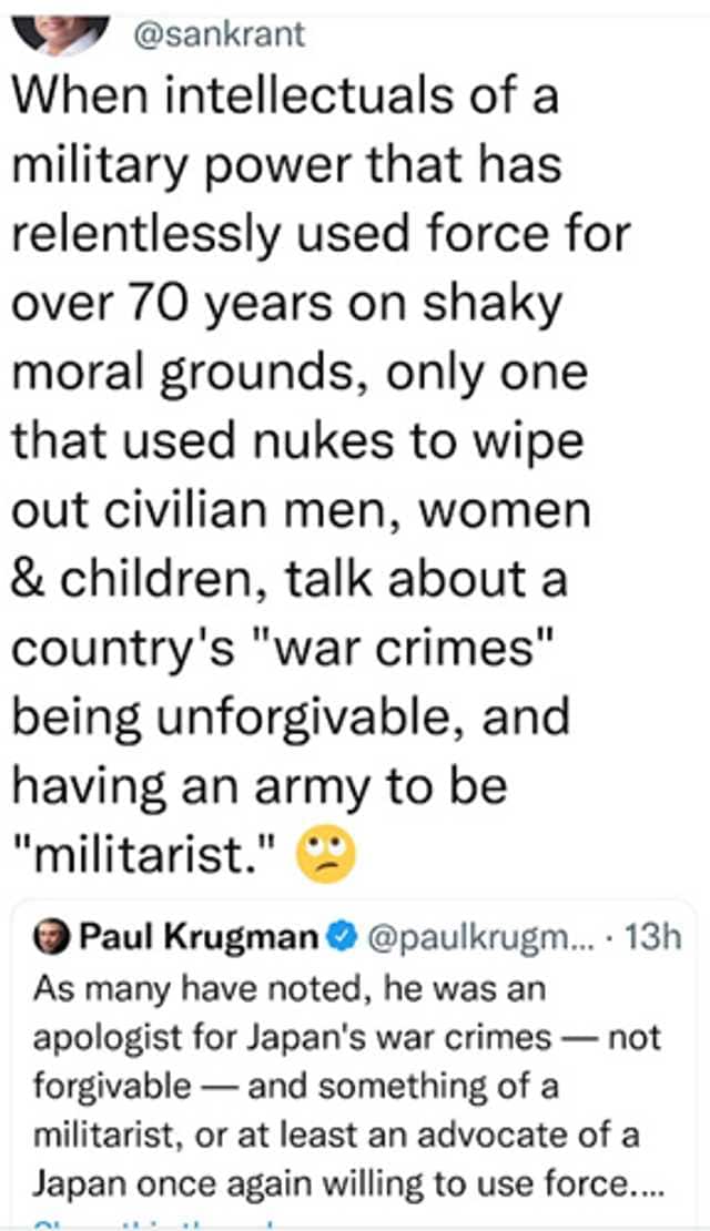 Growing up in India, I too was subject to this negative barrage, but I had the advantage of reading Malayalam translations of Tanizaki, Kawabata and Lady Murasaki in my teenage days. I understood Japan as a unique but dharmic civilisation with integrity and codes of honour. Later, I read about Subhas Chandra Bose’s perspective on imperial Japan, and its support for the Indian National Army. Many years later, I went to Nair San’s Indian restaurant on the Ginza in Tokyo: he had been Rash Behari Bose’s interpreter. The dichotomy of reactions persists. The Western-Chinese narrative against Japan was one of convenience; on the one hand, the Chinese realised that they just needed to shout “Rape of Nanjing”, and the Japanese would give them money to shut them up. On the other hand, the famous “liberal rules-based international order” (