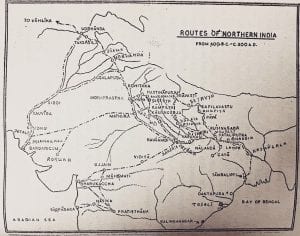 From the proto historic era of the Sindhu Saraswati civilization, India has been a trading nation, offering its luxury and highly prized commodities to the world, such as spices, perfumes, fine textiles (cotton and silk), jewel, steel, and medicines. Indian traders were well known across the proto-historic and ancient cultures of the world; and even within the sub-continent they commanded great respect and held powerful positions within the society, as they busily moved around in their large caravans looking to make profit. Under such a scenario of a flourishing trade and commerce, inevitably the trade routes became the veins of the economic life of the country from the earliest times, as they determined national progress while breaking down barriers of regional and global level economic isolations. Even the tracks of the Paleolithic era, which later developed in trade routes, were signs of social-economic connections between the various cultural groups and subgroups. Roads, tracks, and routes, played an important part not only in trade and commerce, but also helped in socio-cultural exchanges and in the spread of religions from early periods in human civilization. The ancient trade routes are best traced through documentations made in various old texts. As for example, in Rig Veda we find that Marut made routes by breaking the hills that came in the way; routes were also made by burning down trees (as RV tells of Indra who burns down forests to make ways); Agni was considered as the chief deity for making ways and facilitating travelling; while Soma and Pusan were regarded as protectors of roads. Commercial significance of various routes were recognized in the Atharva Veda, and prayers were made to the Earth /Bhu devi for keeping the traders safe from enemies and robbers. Satapatha Brahmana talks of a route from the Saraswati River to central India, and mentions few towns on the way, such as Asandivat (could be Nagasahavya/Hastinapur near Kurukshetra), Parichakra, Kampilya, Nimisa, etc. In the epics Mahabharata and Ramayana, there are mentions of routes followed by travellers, as well the roads taken by the armies. The best sources of the old trade routes as taken by the merchants for their commercial activities (during the time of Buddha and later) are from Pali literature (Buddhist literature), which often present the topography of the routes with a fair amount of accuracy. Uttarapatha [caption id=“attachment_12141962” align=“alignnone” width=“511”] Image 1: Uttarapatha and the various by-roads that are connected to it (600 BCE to 300 CE).[/caption] Among the various ancient trade routes in the sub-continent, the most famous is the Great Northern Route or the Uttarapatha. To trace this ancient route, the best point to start is at Taksasila, which was the capital of Gandhara kingdom. Taksasila, being an important nodal point of trade and education in the ancient times, was connected to Kosala, Malla, Avanti, Kuru, Magadha, Sivi, Sravasti, Kashi, etc. The Uttarapatha, which connected Taksasila to Mathura, went towards the Chenab and Jhelum rivers, initially taking a south-east direction (later turning south), passing through Bhadramkara (Sialkot), Sakala (Sakalanagara/Sagala in Pali), Udamabara (Pathankot), Aggalapura (Agroha), Rohitaka (Rohtak), and Mathura. It is believed that the messengers of Vasistha had taken this very route while travelling between Udumbara and Sakala, the latter being a trade junction of some significance. From Sakala the road reached Mathura via Rohitaka following the Yamuna river course. Mathura being an important trade centre was connected to the various other towns and cities near it (Vernja, Soreyya, Samkasya, Kanyakubja, Payahapatitthana/Prayaga), which formed a part of intra-road-web of the great Uttarapatha. Of these, Soyeyya was an important trade junction, and from Dhammapada Atthakatja it is learned that during the times of Buddha, the caravan route from Sravasti while moving up north towards Taksasila, would go via Soreyya, passing through Saketa, Prayaga, Alavi, Kanyakubja, Soreyya, Hastinapura, and finally meeting the Uttarapatha at Sakala, thus forming one of the important by-routes of the Uttarapatha. Prayaga, situated at the confluence of the Ganga and Yamuna, was another important city by the Uttarapatha, a fording place on the way to Varanasi/Kasi. From Prayaga there were routes connecting it to Vaishali, Sravasti, Sahajati, Kausambi, Veranja, Soreyya, Samkasya, and Kanyakubja. Kausambi, capital of the Vatsas, was one of the great six cities (as per Mahaparinibbanasutta) at the time of Buddha, more important than Prayaga at that time and a busy trading centre that was connected to Kosala, Rajgriha, and Vaisali through direct roads. The connection between Prayaga and Varanasi went through two roads; one avoided Kausambi and directly connected Prayaga to Varanasi; while the other went to Varanasi via Kausambi, Sahajato, and Sumsumagiri (could be Chunar). Varanasi, though subservient to Sravasti at the time of Buddha, was still among the most important cities owing to its religious, cultural, and economic significances, and finds mentions in almost all the jatakas. Varanasi had strong trade connections with Taksasila, and the potters of Varanasi were known to visit Taksasila regularly with their heavy loads of pottery. Owing to its position, Varanasi also had strong trade relations with Campa, Rajgriha, Mithila, and other cities of Uttarapatha. There was also a direct road connection from Varanasi to Gaya via Sarnath, which was most likely followed by Buddha after attaining sambodhi in Uruvela (near Gaya). From Varanasi as the road moved further east, it passed through three important cities- Vaisali, Rajgrha, and Campa. The route was touched at this part (in Vaisali) by roads coming in from Ukkacala (Utkala) and Nalanda. From Vaisali to Rajgrha via Pataliputra the Uttarapatha passed through Nadika, Korigama, Pataligama, Ambalatthika,