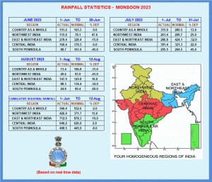 August left India parched as the month ended with a -36 per cent rainfall deficit countrywide. El Nino left its impression as it turned out to be the lowest ever pan-India rainfall in the month of August since the record-keeping began by the Indian Meteorological Department in 1901. • All India rainfall during 1 till 31 August, 2023 is recorded as 162.7 mm against the normal of 254.9 mm lowest ever in 123 years on record keeping. • Central India rainfall during 1 till 31 August, 2023 also registered as lowest ever since 1901 by recording a total of 165 mm against the normal of 308.8 mm, also another region, southern peninsula saw 76.4 mm against the normal of 190.7 mm, the lowest ever rain in the last 123 years. Top ten driest August in India as per the climatology records 1. 2023: 162.7 mm 2. 1913: 189.8 mm 3. 2005: 190.1mm 4. 1920: 190.8 mm 5. 2009: 192.5 mm 6. 2021: 196.2 mm 7. 1993: 198.8 mm 8. 1979: 199.3 mm 9. 1902 and 1905: 202.6 mm 10. 2015: 204.2 mm Out of the total driest months, five have been witnessed in the last 20 years attributed to changing dynamics of monsoon as August gets prone to longer breaks in monsoon. Key cities rainfall performance during August, 2023: • Delhi had its second driest August in the last 14 years. For the second year in a row rainfall in Delhi in August is less than 100 mm. • Mumbai experienced fifth driest August ever, 1) 108.6 mm in 1972 2) 122.9 mm in 1966 3) 153.9 mm in 2015 4) 173.1 mm in 1999 5) 177.2 mm in 2023 • Bangalore recorded just 12.6 mm rainfall in the entire month thus making it the driest ever in the history, Broke the previous monthly all time record of 20.6 mm set way back in 1885. Bengaluru city reported a minimum temperature of 22.9°C making it the warmest August morning in recorded history; the previous highest minimum temperature was 22.5°C observed on the 23 August 1995. • Break in monsoon conditions favour Chennai to experience heavy rain, city’s Nungabakkam observatory recorded 276 mm in the month of August, it became the second wettest August since 2000, The south west monsoon total stands at 542 mm in the city. [caption id=“attachment_13074432” align=“alignnone” width=“768”] Rainfall statistics for the entire monsoon 2023 till 3 September, 2023[/caption] Ahead of a fresh low pressure area that is expected to form up in Bay of Bengal, monsoon has started its revival over east India along with southern peninsula under the presence of moist easterlies winds trigger thunderstorms and wind discontinuity in peninsula leading to convective development over the weekend. Rainfall ending 8:30 am on Sunday morning in few major cities: Vijayawada: 59 mm Bhubaneswar: 47 mm Madurai: 45 mm Mumbai Colaba: 35 mm Hyderabad: 29 mm Kolkata: 28 mm Kochi: 20 mm Patna: 18 mm Raipur: 13 mm Trivandrum: 12 mm However, under the influence of anti-cyclonic circulation, dry and hot winds have been blowing across the northwest and western India. Maximum temperature reported on Saturday afternoon at a few major cities; Hisar: 39°C Jaipur: 37.2°C New Delhi: 37.2°C Lucknow: 37°C Patiala: 37°C Amritsar: 36°C Chandigarh: 35.2°C Drought prone areas of Karnataka received good rains ending 8:30 am on 3 September 2023: Kolar: 89.5 mm Chamarajanagar: 78 mm Chikkaballapura: 73 mm Bengaluru Rural: 65.5 mm Tumkur: 61 mm Mysore: 55 mm Mandya: 48 mm Chikkamagaluru: 37 mm Hassan: 30.5 mm Gadag: 26 mm Bengaluru Urban: 25 mm As on 3 September, the seasonal rainfall over pan India stands at an actual of 639.1 mm against the normal of 721.1 mm the departure from normal stands at -11 per cent compared to week on week of -7 per cent, fell by another 4 per cent. Subdivision wise seasonal rainfall in the period of 1 June till 3 September 2023: • Southern Peninsula: Actual 490.1 mm against the average of 571.8 mm, -14 per cent departure from normal. • East and North East India: Actual 914.6 mm against the average of 1112.5 mm, -18 per cent departure from normal. • North-West India: Actual 500.8 mm against the average of 500.2 mm, +0 per cent departure from normal. • Central India: Actual 722.0 mm against the average of 824.5 mm, -12 per cent departure from normal. [caption id=“attachment_13074442” align=“alignnone” width=“722”]