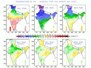 The month of January ends on a wet note for most parts of North India where a strong Western Disturbance brought in heavy snowfall over the western Himalayas and Moderate rains were recorded in the plains. January overall has been cooler than normal month for most parts of North, West and Central India, except states in East and some parts southern India where it has been significantly warmer than usual. [caption id=“attachment_12109042” align=“alignnone” width=“505”] Maximum, Minimum and Mean temperature during the month of January, 2023[/caption] If we analyse data for national capital Delhi maximum temperatures were markedly below normal on 27th and 30th, appreciably below normal on 4th, 5th and 26th, below normal on 3rd, 6th, 7th, 8th, 15th and 16th, appreciably above normal on 24th and above normal on 13th, 20th, 21st, 22nd and 23rd and nearly normal on remaining days of the month. The mean maximum temperature was 19.7°c, which is 0.4°c below its climatological mean for the month, i.e. 20.1°c. The highest maximum temperature was 25.9ºc recorded on the 24th of the month. The all-time record of maximum temperature for the month is 32.5ºc recorded on 28th January 2004. Minimum temperatures were markedly below normal on 8th and 16th, appreciably below normal on 5th, 6th, 7th, 9th,17th, 18th and 27th, below normal on 1st, 4th, 15th, 28th and 29th, appreciably above normal on 20th, 24th and 26th, above normal on 12th, 13th, 14th and 25th and nearly normal on remaining days of the month. The mean minimum temperature during the month was 6.6ºc, which is 0.9ºc below its climatological mean for the month, i.e. 7.5 ºc. The lowest minimum temperature was 1.4ºc recorded on the 16th of the month. The all-time record of minimum temperature for the month is -0.6ºc recorded on 16th January 1935. The cold wave conditions in Delhi were realized for 8 days during January, 2023 (continuous spell of 5 days and 3 days). This number is the highest since 2008, when it was realised for 12 days. Under the influence of the western disturbance earlier in the week heavy snow accumulated all over the western Himalayas. Total snow depth in the month of January, 2023 from Kashmir: Gulmarg: 258.3cm Pahalgam: 212.6cm Kokernag: 162.5cm Qazigund: 146.4cm Kupwara: 42cm Srinagar: 40.5cm Bhaderwah: 21cm Batote: 11cm Total snowfall during the month of January in stations of Himachal Pradesh: Kothi: 172.5cm Gondhla: 150.0cm Khadrala: 133.0cm Sangla: 100.0cm Kalpa: 76.3cm Bharmour: 45.0cm Manali: 27.8cm Shimla: 6.0cm After the passage of the western disturbance a severe cold wave gripped Himalayas, Nyoma in Ladakh recorded -31.0°c on 31 January and -31.9°c on 1 February, 2023. Became the first station in the country to record a minimum temperature below -30°c for the first time in this season. Following good spell of precipitation in Himalayas, plains of North India and in parts of Tamil Nadu and Kerala in South seasonal rainfall figures have improved compared slightly, country as whole received 15.5mm rainfall during 1 January till 5 February against the normal of 19.8mm, departure from normal stands at -22%, came down from -41% on 28th January. Subdivision wise seasonal rainfall in the period of 1 January till 5 February, 2023: • Southern Peninsula: Actual 6.0mm against the average of 8.6mm, -30% departure from normal. • East & North East India: Actual 1.9mm against the average of 21.3mm, -91% departure from normal. • North West India: Actual 43.4mm against the average of 38.8mm, +12% departure from normal. • Central India: Actual 1.9mm against the average of 8.4mm, -78% departure from normal. [caption id=“attachment_12109062” align=“alignnone” width=“511”]