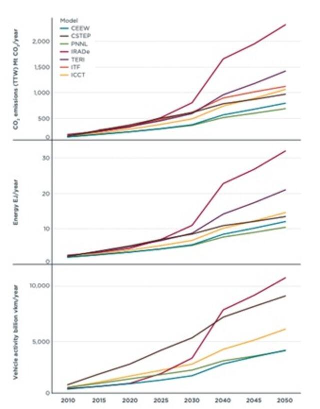 Figure 1: The different models estimate key trends under Business as Usual (BAU) scenarios for India’s road transport sector.