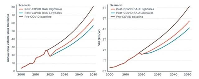 Figure 2. Vehicle sales and vehicle activity under pre- and post-COVID-19 BAU scenarios
