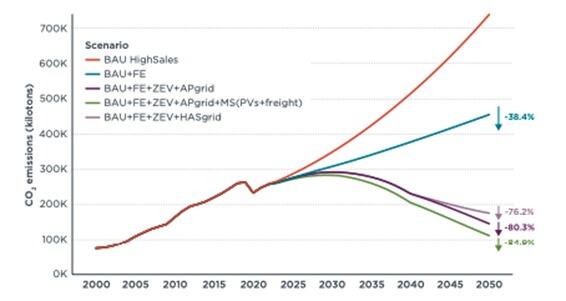 Note: AP: Aggressive Policy scenario; HAS: High Ambition Scenario, FE: ICE vehicle fuel efficiency improvement, ZEV+grid: Vehicle electrification along with grid decarbonization; MS (PVs+freight): Mode shift (Private vehicles to buses and HDT to electric rail)