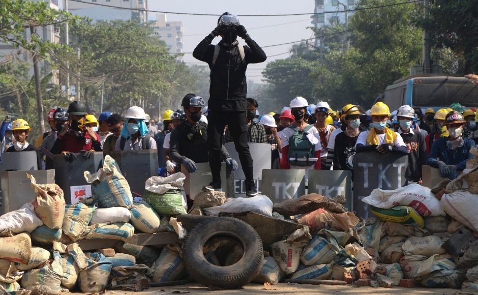 In this 7 March, 2021, file photo, protesters take positions behind a barricade as police gather in Yangon, Myanmar. (AP Photo, File)