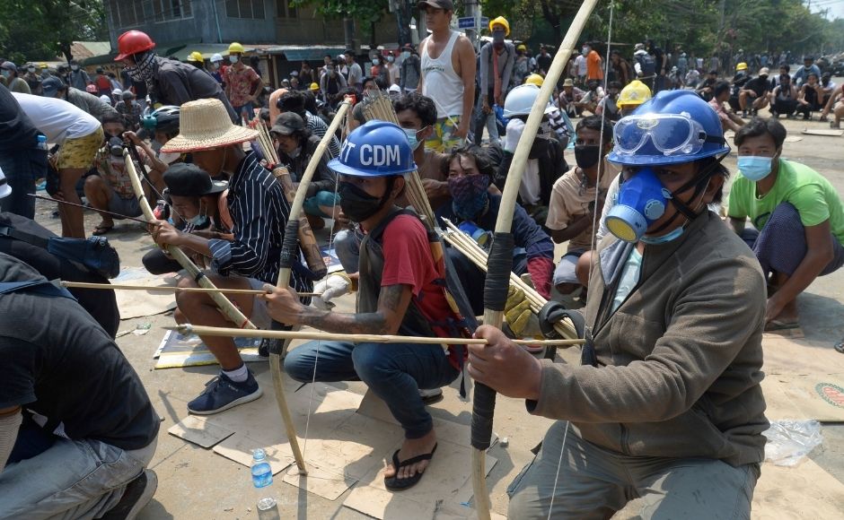 In this 27 March, 2021, file photo, anti-coup protesters prepare makeshift bow and arrows to confront police in Thaketa township Yangon, Myanmar. (AP Photo, File)