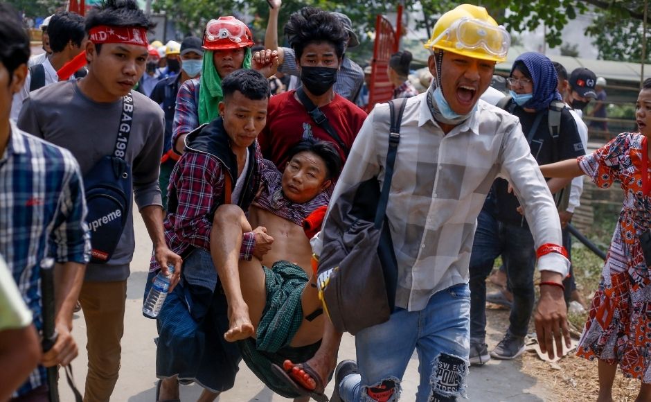 In this 14 March, 2021, file photo, anti-coup protesters carry an injured man following clashes with security in Yangon, Myanmar. (AP Photo, File)