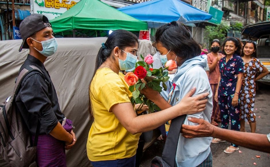 In this 26 March, 2021, file photo, an anti-coup student protester is welcomed home with flowers by the residents of her neighbourhood after being released from jail in Yangon, Myanmar. (AP Photo, File)