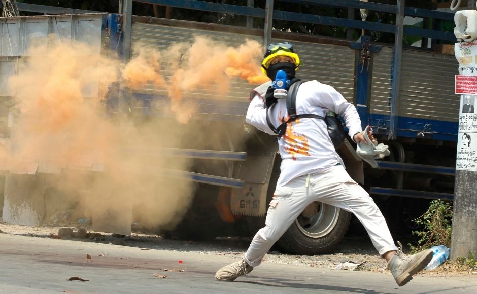 In this 27 March, 2021, file photo, an anti-coup protester throws a smoke bomb against police crackdown in Thaketa township Yangon, Myanmar. (AP Photo, File)