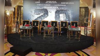 From left: Amy Jackson, AR Rahman, Shankar, Rajinikanth, Subaskaran and Akshay Kumar. Image courtesy: Twitter