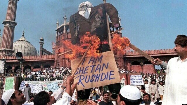 The Satanic Verses is Salman Rushdie's fourth novel, which was published in September 1988. It was inspired by the life of Prophet Muhammad, which caused widespread outrage among the global Muslim community. Here, Muslims burn an effigy of the author during a demonstration near India's largest mosque in New Delhi in February 1999. AFP File