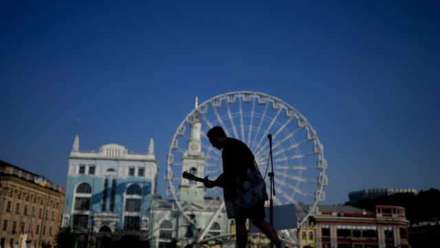 A street musician performs in Kyiv, Ukraine, 10 June, 2022. With war raging on fronts to the east and south, the summer of 2022 is proving bitter for the Ukrainian capital, Kyiv. AP