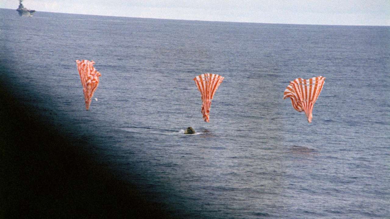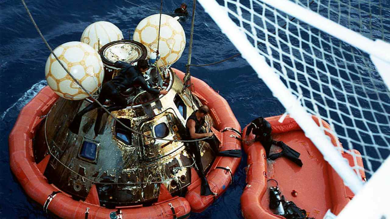 The command capsule’s guidance system was turned off after the explosion and the spacecraft had drifted off course during its re-entry into the Earth’s atmosphere. After making a few corrections and using some ingenious methods, the Apollo 13 safely splashed down into the Pacific Ocean and the crew was scooped out of the craft. Image credit: NASA