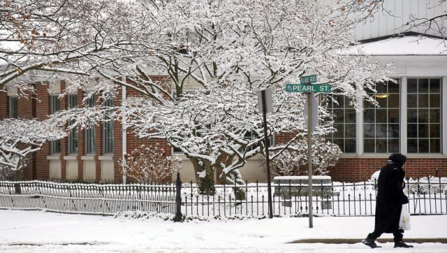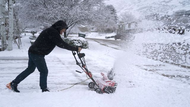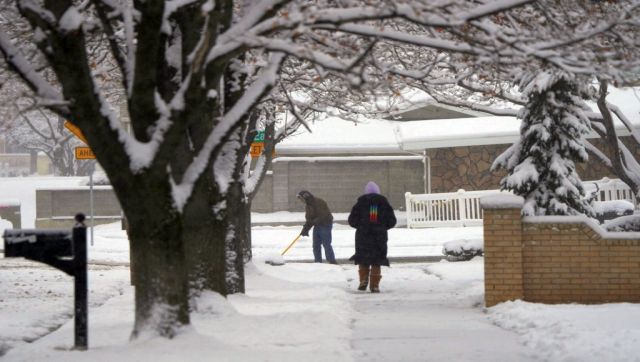 A man clears his driveway of snow as a woman walks down the sidewalk after an overnight storm in Provo,Utah. Winter storm alerts have been issued from the Canadian border to the Mexican border and blizzard warnings extend from just west of Denver into the Dakotas. AFP