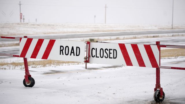 The gate is closed on an on ramp to the eastbound lanes of Interstate 70 at East Airpark Road in Aurora, Colorado. A massive winter storm has closed roads throughout northeast Colorado. AP