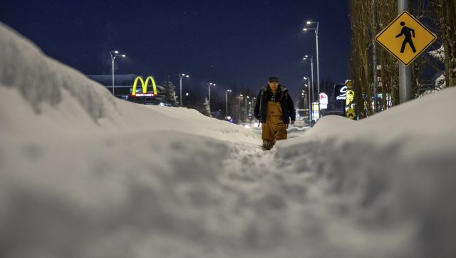 A pedestrian walks through deep snow along Tudor Road in Anchorage, Alaska. The current snow depth in Anchorage, Alaska, is 31 inches, making it the greatest since 27 March 2012, according to a tweet from Alaska climate scientist Brian Brettschneider. AP