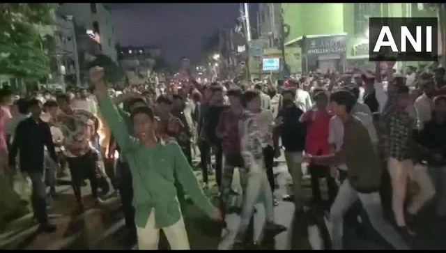 Protests against T Raja continued through the night in Hyderabad. Protesters demanded action against T Raja after he was granted bail. Image Courtesy: @ANI/Twitter