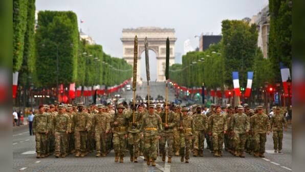 Members of US Army 1st Division, US Air Force, US Navy, and US Marines march down the Champs-Elysees Avenue during a rehearsal for the French Bastille Day parade in Paris. Bastille Day is the French National Holiday that commemorates the beginning of the French Revolution on 14 July, 1789. AP