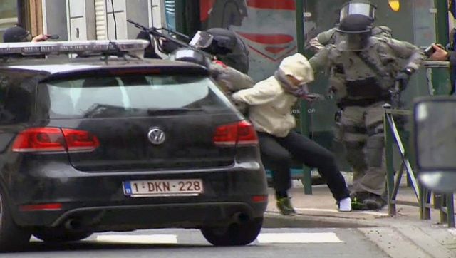 Salah Abdeslam, centre, was arrested by police on March 18, 2016 and bundled into a police vehicle during a raid in the Molenbeek neighbourhood of Brussels. Salah had dropped the stadium bombers off and whose brother was one of the restaurant attackers. AP