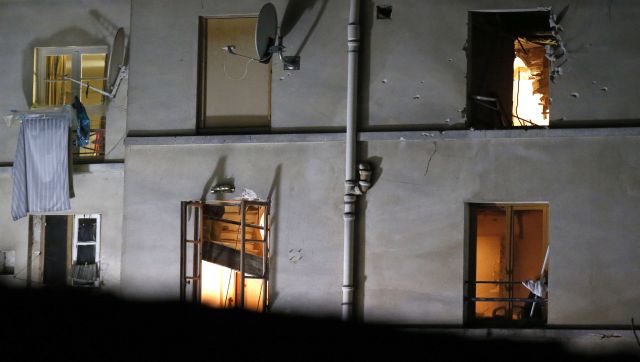 Bullet holes and smashed windows are pictured on the back side of the house after an intervention of security forces against a group of extremists in Saint-Denis, near Paris. AP
