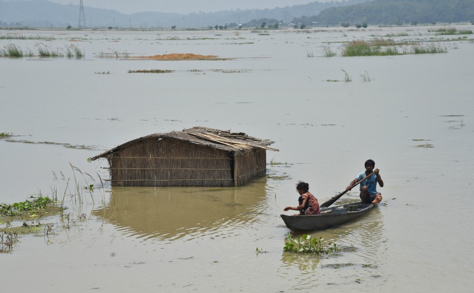 A boy rows a boat past a submerged hut in a flooded field at Mayong village in Morigaon district of Assam. Close to 12 lakh people in 24 districts of Assam continued to reel under floods as the death toll reached 60 in the state on Saturday. Reuters