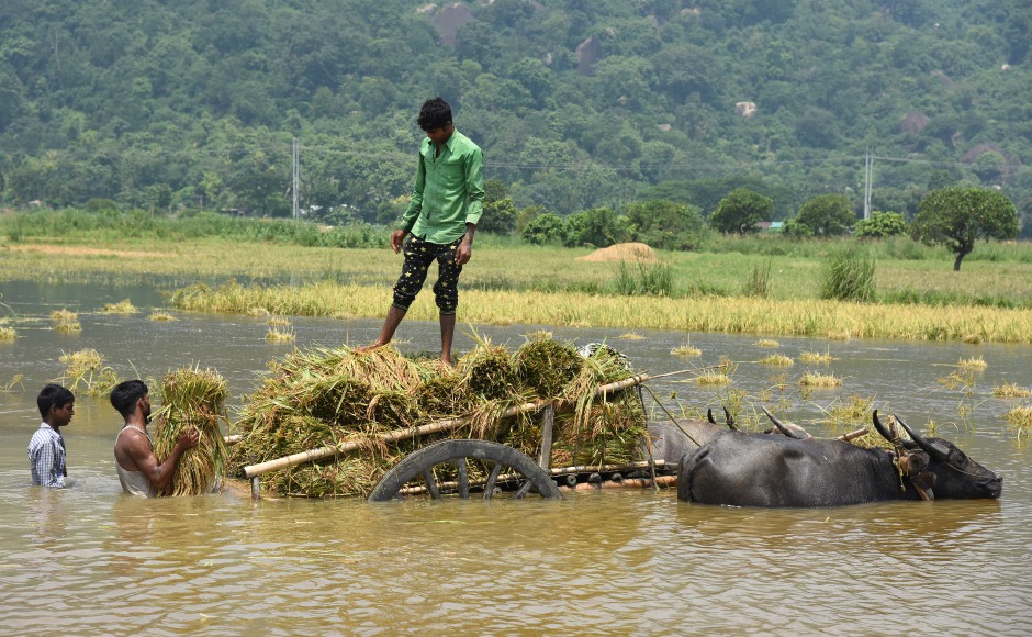 People load their harvested crop onto a buffalo cart in a flooded paddy field at Mayong village in Morigaon district in Assam to escape to dry areas. According to a report by the Assam State Disaster Management Authority, another person died in the district on Sunday. Reuters